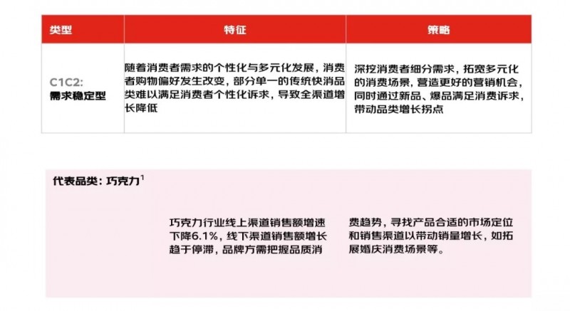 基于上述销售额(A2、B2、C2、 D2)和销售量(A1、B1、C1、 D1)的品类增长趋势地图分布位置,尼尔森将典型快消品类划分为16个象限,定位品类增长格局。我们发现快消品类主要集中在四个象限中,且线上渠道销售额或销售量增速高于全渠道增速,所以品类布局整体呈现“对角线”格局,且不存在全渠道增速高于线上渠道的情况,因而存在部分空白象限。对巧克力品类而言,由于人们消费观念改变,对此品类的消费需求下降,因此呈现出线上渠道和全渠道整体增速均低的趋势。