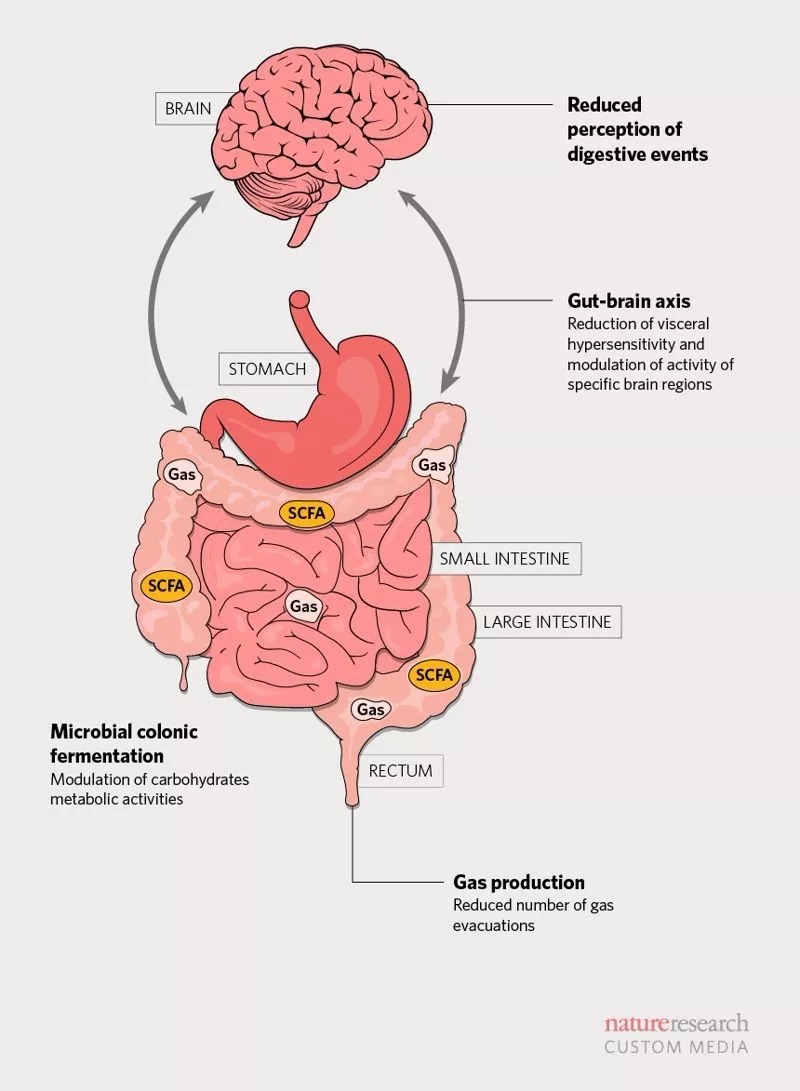 我们能够提供一个工作模型,捕获 BFMP 的不同作用的潜在模式11。研究表明,BFMP 可以刺激产生有益短链脂肪酸的途径,减少肠道气体的产生13,14。在内脏-大脑轴方面的不同的研究表明,该产品可以减少内脏过敏和调节大脑活动10,15。