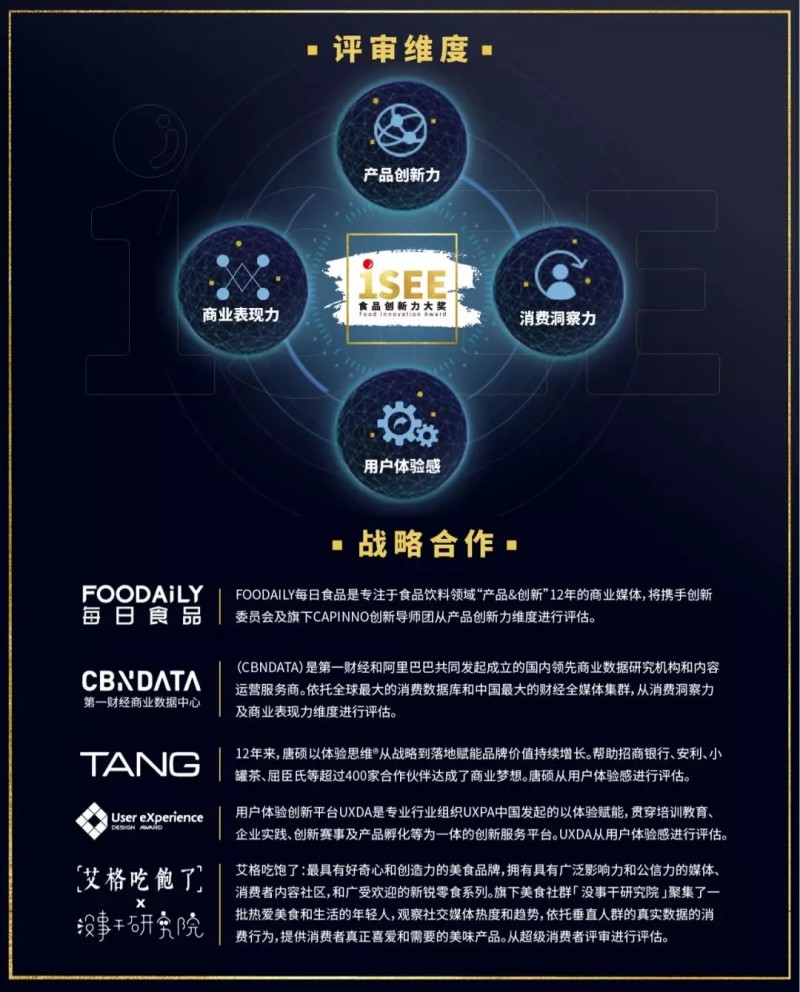 我们相信每一个好的产品和品牌都应该被看见,因此发起“iSEE食品创新力大奖”,并联合第一财经商业数据中心CBNData、唐硕体验咨询、UXDA用户体验创新平台、艾格吃饱了及旗下没事干研究院等共同发力,旨在从产品创新力、消费洞察力、商业表现力、用户体验感等多个维度进行评估,打造一套衡量中国食品饮料行业品牌创新力的黄金标准,借此发现并鼓舞那些勇于捕捉新商业环境下细分领域市场机会的创新势力,共同为食品行业的创新发展凝聚力量,加速赋能。