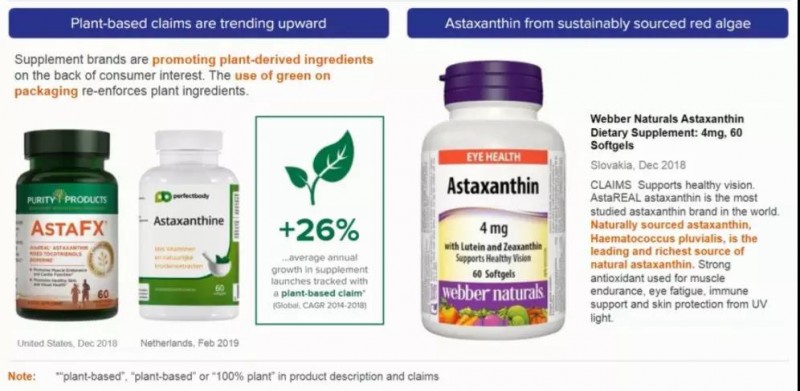 近几年,植物性原料越来越受欢迎,藻类成分就是一个比较典型的品类。Innova Market Insights市场数据显示,2014-2018年,全球推出的以植物基健康声称为主的膳食补充剂产品复合年增长率为26%,越来越多的膳食补充剂产品配方中添加植物基原料,同时外在的包装也采用绿色以迎合植物原料趋势。