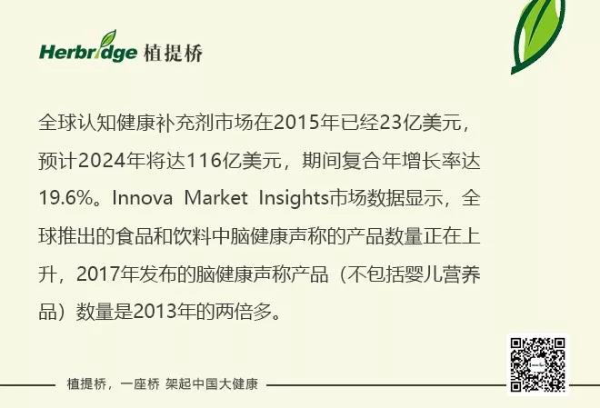 Innova Market Insights市场数据显示,全球推出的食品和饮料中脑健康声称的产品数量正在上升,2017年发布的脑健康声称产品(不包括婴儿营养品)数量是2013年的两倍多。市场研究机构还将“我感觉很好”列为2019年十大趋势之一。这种趋势表明,消费者对那些有助于情绪改善的活性成分感兴趣。