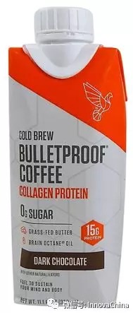 2014-2018年间,Innova数据显示全球范围内追踪到带有肌肤健康宣称的食品饮料新品发布(含膳食补充剂)年均复合增长率为+14%。Bulletproof顺势推出黑巧克力风味冷萃咖啡胶原蛋白饮料,每瓶含胶原蛋白15g,既有提神的功效又能美容养颜。
