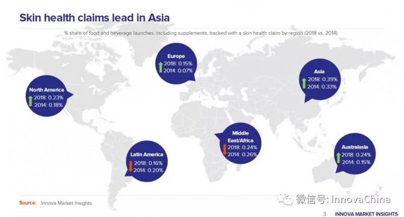 根据Innova追踪到的带有肌肤健康宣称全球食品饮料新品(含膳食补充剂)数据,除拉美和中东/非洲地区,全球范围内肌肤健康宣称的应用持续增长,其中亚洲地区相关新品发布量占比全球持续领先,2014年和2018年该地区肌肤健康宣称新品分别占其总发布量的0.33%和0.39%。2018年,澳新地区肌肤健康宣称的应用增长显著,占其总量的0.24%,较2014年增长了0.09%。欧洲和北美地区肌肤健康宣称的发展同样迅猛,从2014年全球较低水平发展到2018年与多数地区水平相近,比例分别从2014年0.07%和0.18%上涨到2018年0.15%和0.23%。