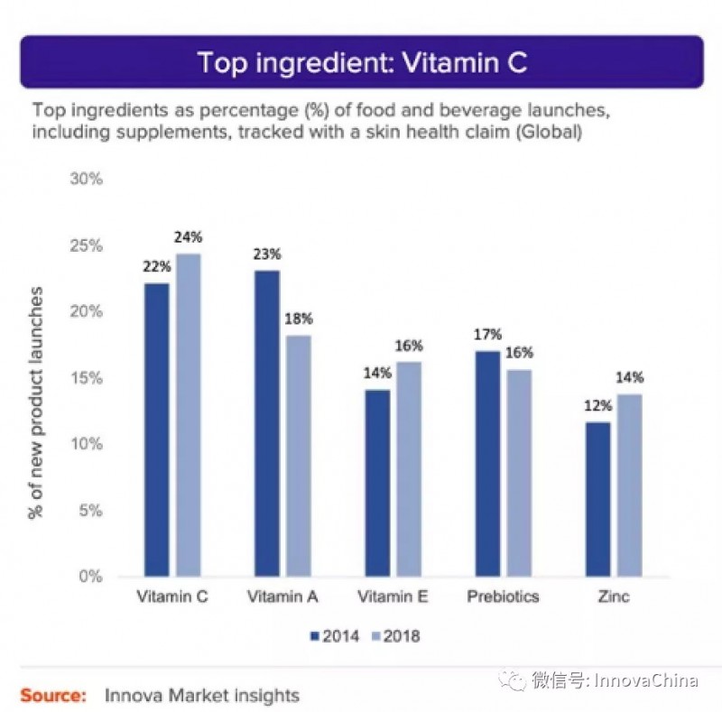 2014年带有肌肤健康宣称的食品饮料新品发布(含膳食补充剂)中原料维生素A的应用(23%)仅以微弱差距领先维生素C(22%)。2018年维生素C(24%)超越维生素A(18%)成为领先原料,前五原料中还有维生素E(16%),益生元(16%)和锌元素(14%)。因各类维生素对人体和肌肤有不同的功效,复合维生素产品是常见的应用形式。