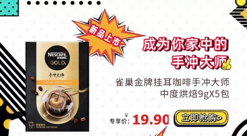 继“双12”在京东首发后,雀巢挂耳咖啡将陆续扩大分销渠道。据该公司透露,自12月16日起,新品将入驻天猫等其他电商平台,同时在线下大润发超市上市。而在2020年春节后,新品将在全国的线下超市“全面铺开”。