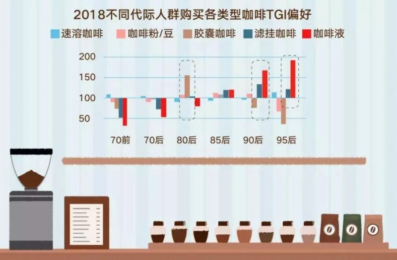 根据CBNData联合天猫在今年5月发布的《2019年线上咖啡行业趋势洞察》显示,虽然速溶咖啡占了近7成的市场份额,但2018年滤挂咖啡、胶囊咖啡市场规模增速突出。在消费群体上,90后、95后更偏好滤挂咖啡和咖啡液。