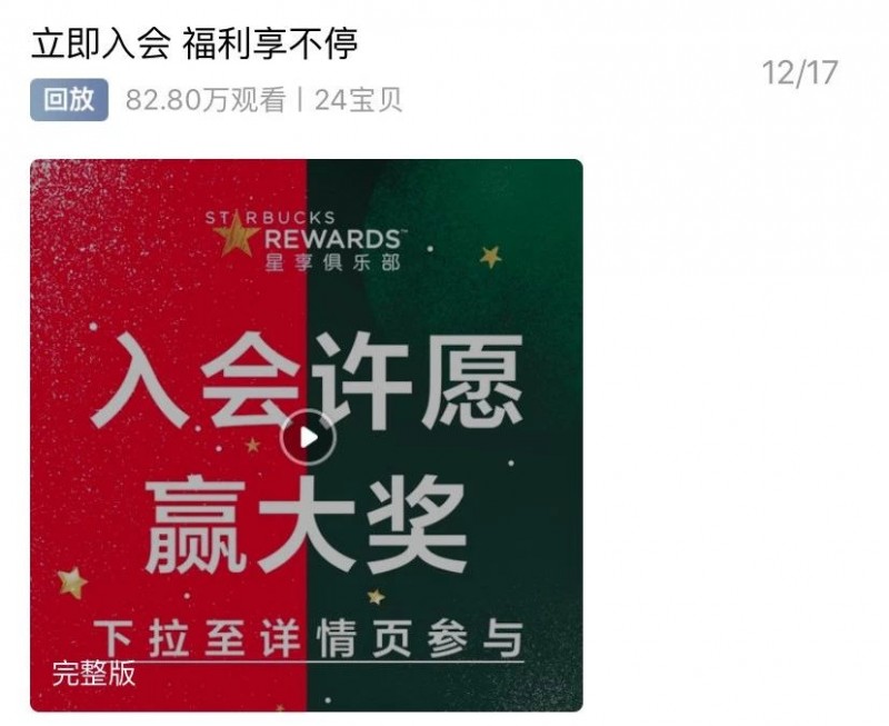 12月17日晚,星巴克在自己的天猫旗舰店开了一场直播。从晚上7点到10点,3个小时内,显示有82.8万人在线观看。