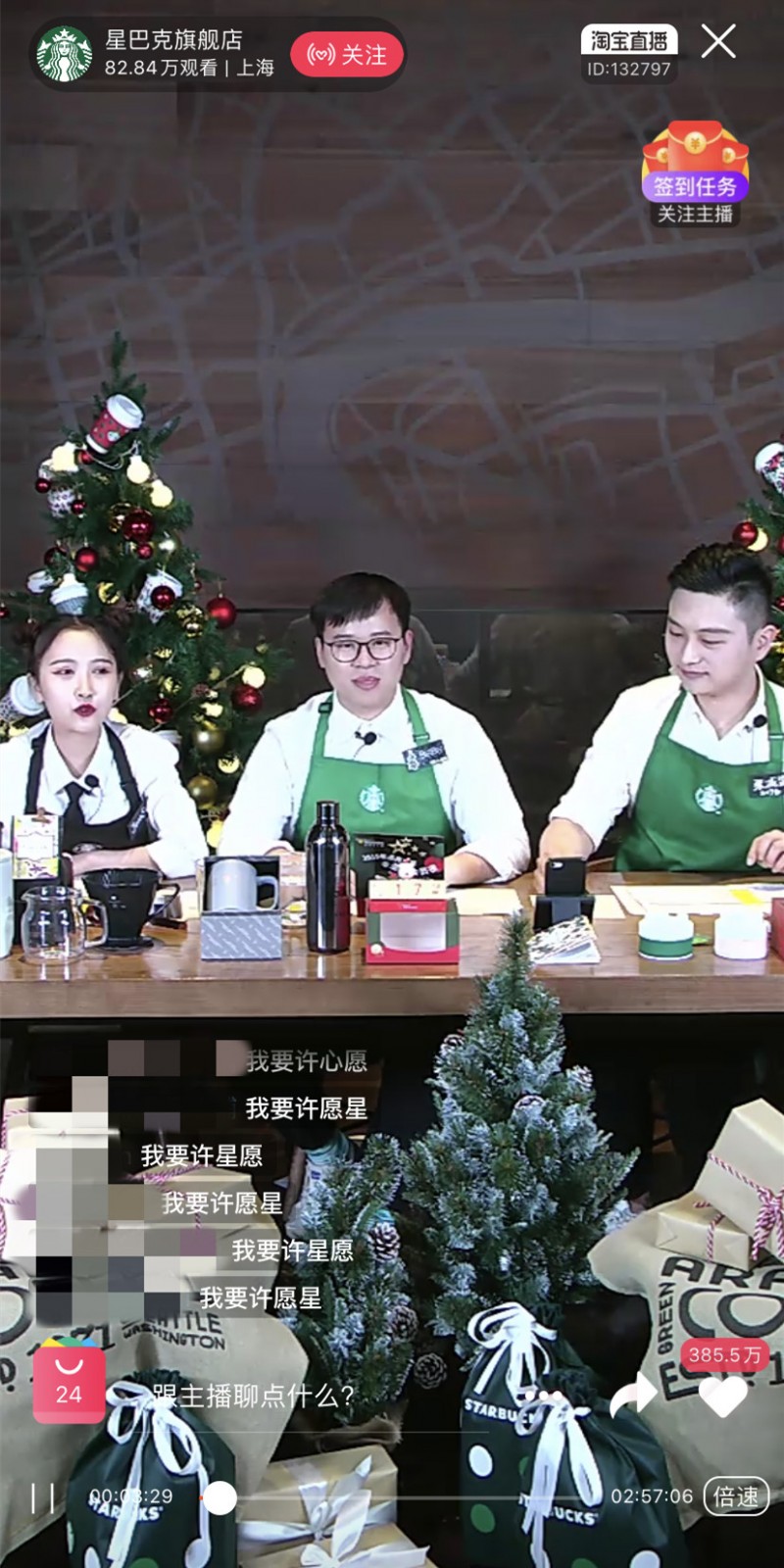3位主播坐在熟悉的星巴克长条桌前,一边介绍产品,一边引导下单。粉丝热火朝天地刷着“我要许星愿”,参与抽奖。