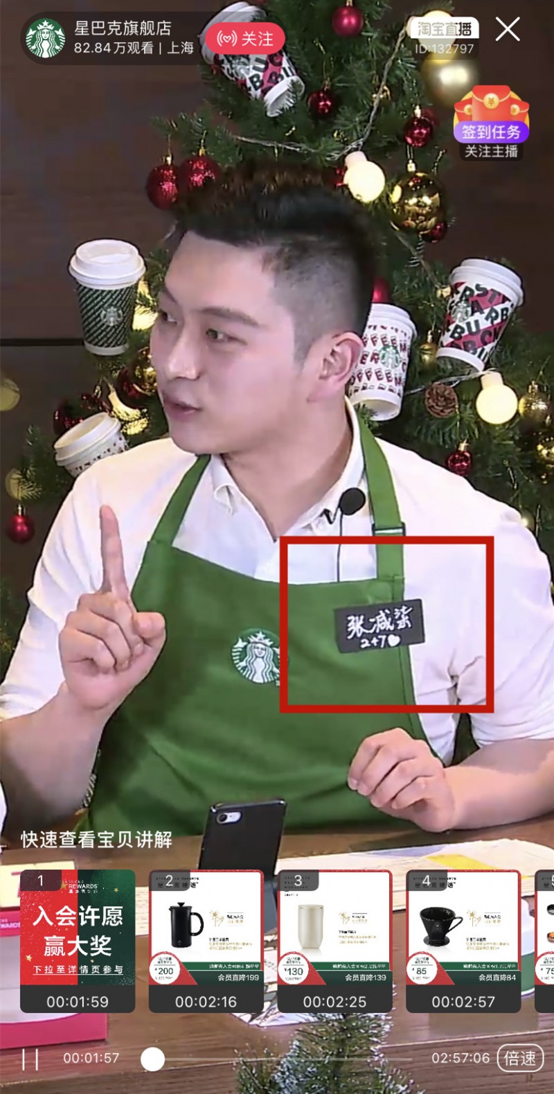 主播台后是装饰精美的圣诞树,前面放置了很多礼物盒。看得出来,星巴克想要努力打造出和到店消费一样的感受,传递出更多品牌温度。