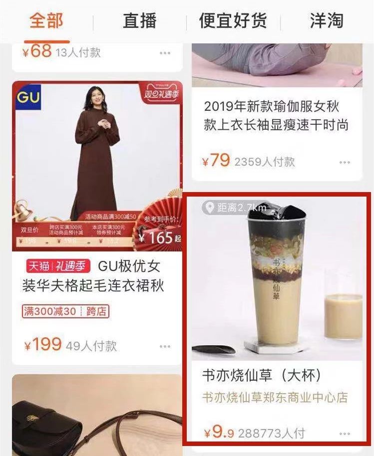随手打开淘宝,在常见的推荐页面,竟然能看到书亦烧仙草的产品推荐,有价格有附近门店介绍。