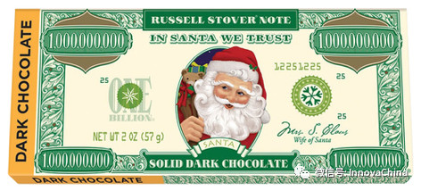 产品描述:美味黑巧克力,完美的圣诞礼物。57g铝箔装,外部纸盒装。圣诞系列。外包装上将圣诞老人形象与美元相结合,百万美元的面值强调了产品的美味,是一款既有趣又可爱的圣诞礼物。
