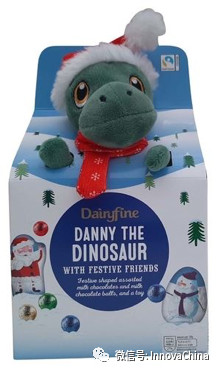 产品描述:混装独立包装的牛奶巧克力和牛奶夹心巧克力,塑料盒装。外部纸盒装,纸盒中顶部部装饰着一只带有圣诞帽和围巾的绿色小恐龙。圣诞系列。公平贸易认证。可回收包装。