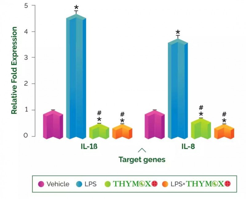 Plantamed上发表的一篇文章显示,百里香地上部分通过水醇(乙醇70%-水30%,根据Eur. Ph. 8.0的一般方法)提取的Thymox-EPO,经3D体外细胞模型测试,发现该成分能够通过减少促炎介质蛋白如NF-kB p65和NF-kB p52以及促炎细胞因子IL-1β和IL-8来减轻LPS(Lypopolysaccharide)对呼吸道上皮细胞诱导的炎症,证明了其具有很强的抗炎性。[6]