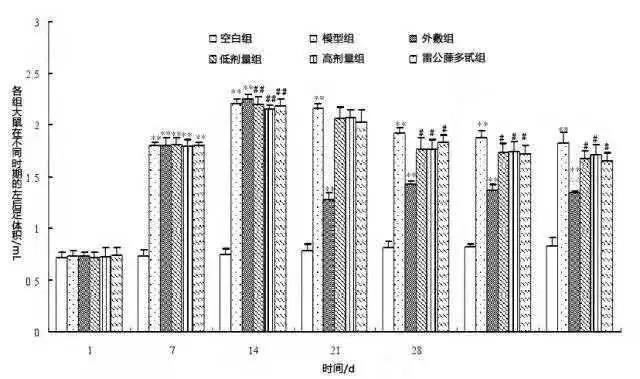试验将大鼠随机分为6组,每组十只,建立类风湿性关节炎模型致炎后第15d当动物形成稳定的胶原诱导的关节炎模型(CIA)后开始给百里香提取物,每天1次,连续28d。空白对照组与模型组灌胃等量植物油5mL/kg,外敷组将百里香提取物涂于肿胀部位,高剂量组灌胃百里香提取物2.5mL/kg,低剂量组灌胃百里香提取物为13mL/kg,阳性对照组灌胃给雷公藤多甙(类风湿性关节炎治疗药物)300mg/kg。