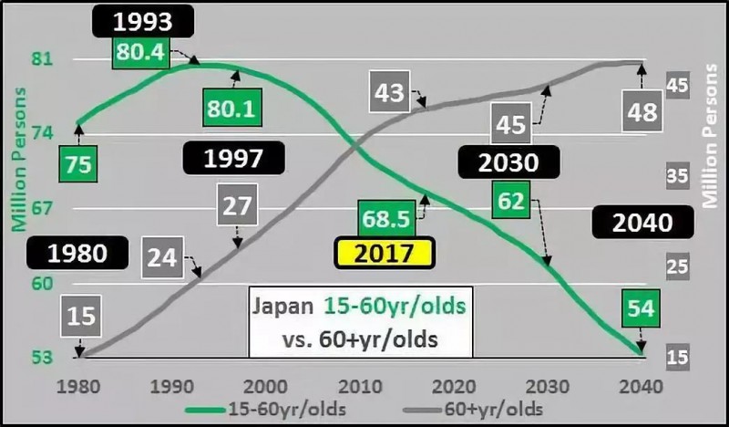 日本老龄化非常严重,厚生劳动省调查数据显示,60岁以上老年人口不断上升,截止2018年,60岁以上人口达到4300万,是1980年的近3倍。