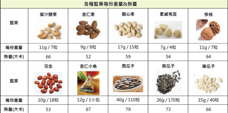 根据2016年新版中国居民平衡膳食宝塔,大豆和坚果类推荐量是25-35克,再看看下表,你就说吧,你能控制自己一次只吃4粒夏威夷果吗?