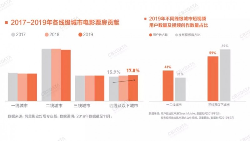 阿里影业灯塔数据显示,观影正在四线及以下城市加速渗透;在影片题材上,喜剧片尤其受到喜爱。而在碎片化的闲暇时间,他们则以刷短视频、看直播为乐,同时CBNData《报告》显示,下沉市场人群发布视频数量占比高于其他用户规模占比,可见他们不仅爱看,更是一群热爱创作的人。