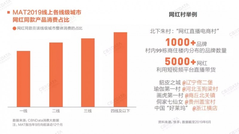CBNData《报告》显示,网红达人成为下沉市场人群接触潮流风向的窗口,“网红“同款在越是下沉的市场消费占比越高。此外,除了爱追“网红”之余,他们也善于打造“网红”。有越来越多下沉市场消费者利用短视频平台找到商机,打造出诸如以北下朱村、画虎村等“网红村”。