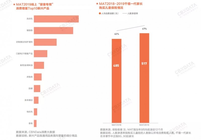 CBNData《报告》显示,千禧一代爸妈的精细化育儿诉求,推动了更多线上“婴童专用”新兴产品的流行。在婴童消费上精益求精的同时,千禧一代家长还有着成熟、全面的风险管理意识。保险极客数据显示,近两年购买儿童保险的千禧一代爸妈人数比例及人均支出都在提升。