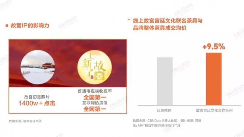 不论是品牌合作、内容植入,或是明星代言,都遵循调性匹配的原则,选择自带流量的IP进行合作时,更当以引起消费者舒适为先,加深品牌情感纽带为主要目的。以经典文化IP故宫宫廷文化为例,其与茶具品牌的跨界产品,融合了千里江山图的诗意及中国茶文化的禅意,相得益彰的同频互动,成功引发了消费者的情感共鸣,使他们欣然支付溢价。