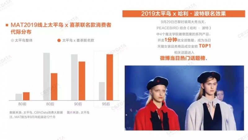 与年轻人喜欢的一切产生关系,那品牌也就潜移默化成为了年轻人“社交网”的一员,而今对于想快速撬动年轻人市场的品牌而言,新生代人群喜爱的品牌便是可借力的抓手。以近两年来跨界频频的服饰品牌太平鸟为例,在2019年先后联名了喜茶、哈利波特等,在为品牌带来新鲜感,加深品牌纵深感的同时,也实现了彼此受众的融合打通,扩大了品牌对新生代人群的吸引力。