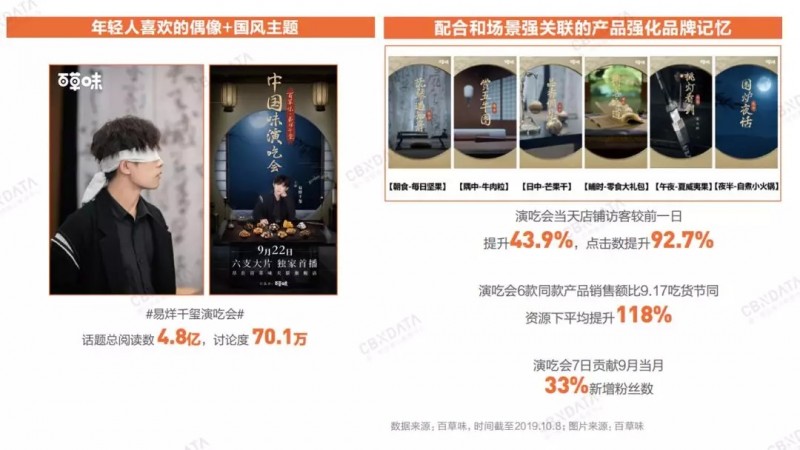 以百草味为例,品牌在《长安十二时辰》热播时携手代言人易烊千玺打造演吃会IP内容,结合“国风”主题的6 支“十二食辰”短视频,通过场景配合实现与产品的强关联,有效强化了品牌记忆,并有针对性地触及了品牌的目标年轻消费者。