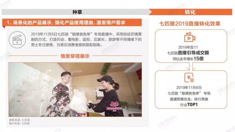而除了“借势”明星势能外,场景化、趣味化的内容亦能实现传播效率的优化。以男装品牌七匹狼为例,2019年双11期间,品牌在直播中采用轻情景剧的方式,透过营造细分场景,展示产品的多种穿搭方式,有效激活了潜在消费者的购买需求,实现了可观的销售转化。