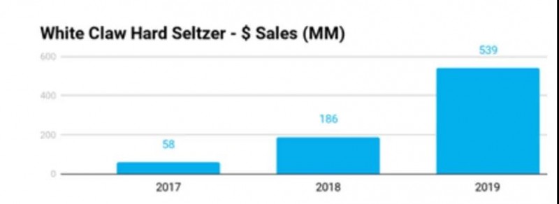 White Claw在2019年实现了突跃式增长。尼尔森统计数据显示,与去年同期相比,White Claw 7月份饮料的销售额增长了283%,达到3.277亿美元,甚至在9月份卖断了货。
