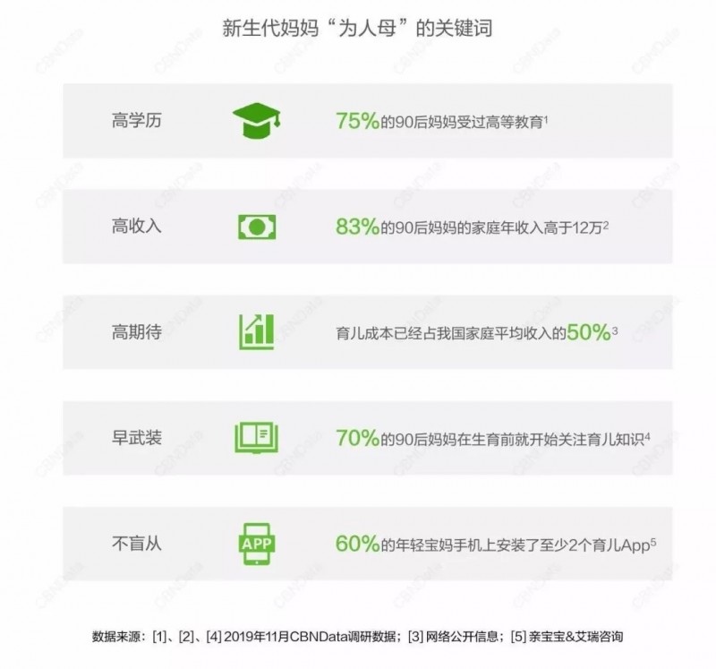 CBNData《白皮书》显示,中国目前90后女性数量约达到了9000万,以该年龄段为代表的女性逐渐成为育儿的新生力军。相比上一代,多元的成长环境造就了当代年轻妈妈“高学历”、“高收入”、“高期待”、“早武装”、“不盲从”的特点,为新时代“母亲”赋予了新定义。