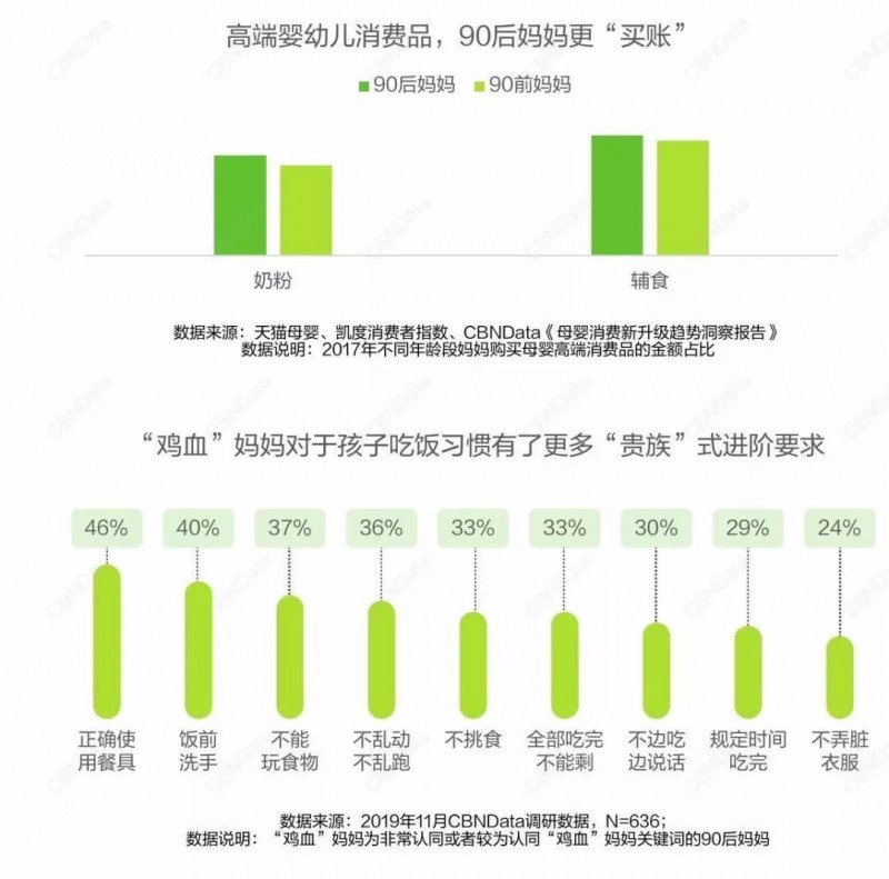根据CBNData《白皮书》显示,90后妈妈相对更愿意为高端婴幼儿奶粉及辅食买单;且从“正确使用餐具”、“饭前洗手”,到“规定时间吃饭”、“不弄脏衣服”等,“鸡血”妈妈对孩子吃饭习惯上的要求,呈现了“贵族”式的进阶。