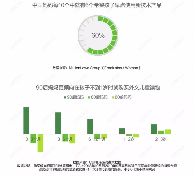 “不输在起跑线”对于“鸡血”妈妈而言是基本要求,能在“起跑线抢跑”才是她们更加迫切想要实现的。根据CBNData《白皮书》显示,中国妈妈每10个中就有6个希望孩子早点使用新技术产品;此外,90后妈妈更倾向在孩子不到一岁时就购买外文儿童读物。以上数据均不同程度上呈现了她们“人无我有,人有我优”的心态。