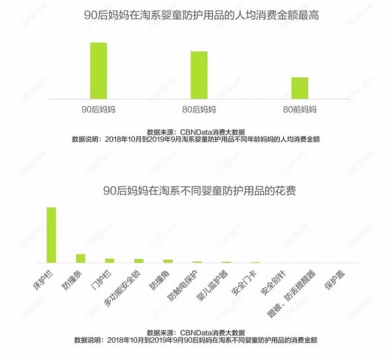“管家”妈妈总是认为孩子还小,安全意识尚浅,极其容易发生意外和安全事故,因此安全防护方面的措施可谓时做到事无巨细,有备无患。CBNData《白皮书》显示,新生代宝妈在婴童防护用品的人均花费最高,且消费涉及品类众多,其中“床护栏”尤其受到青睐。