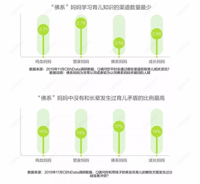 也许是家有长辈帮衬,也许是天性使然,“佛系”妈妈在育儿上看起来“心很大”。CBNData《白皮书》显示,在四个类型妈妈中,相较于“鸡血”妈妈的笃定和“管家”妈妈的面面俱到,“佛系”妈妈学习育儿知识的渠道数量上最少;同时相较于其他妈妈群体,她们对“长辈带孩子”要求较低,育儿矛盾最少。