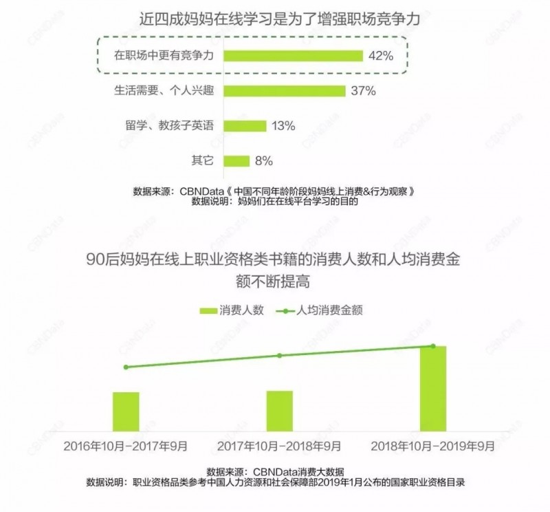 相较于把希望寄托于“早教”,“成长”妈妈显然更认同“父母是孩子最好的榜样”。根据CBNData《白皮书》显示,近四成在线学习的妈妈是为了增强自身的竞争力,且她们为自我增值的花费不断提高。显现了她们身体力行去实现自己不断进取的心态。