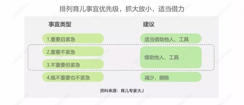 无论具备四型妈妈的哪些特质,新生代妈妈的共同诉求是时间和帮手。大J鼓励妈妈们不耻于说出自己的困境,建议将所有育儿事宜按优先级排序,将次优级“外包”,进而用更好的状态迎接“最优级”事项。