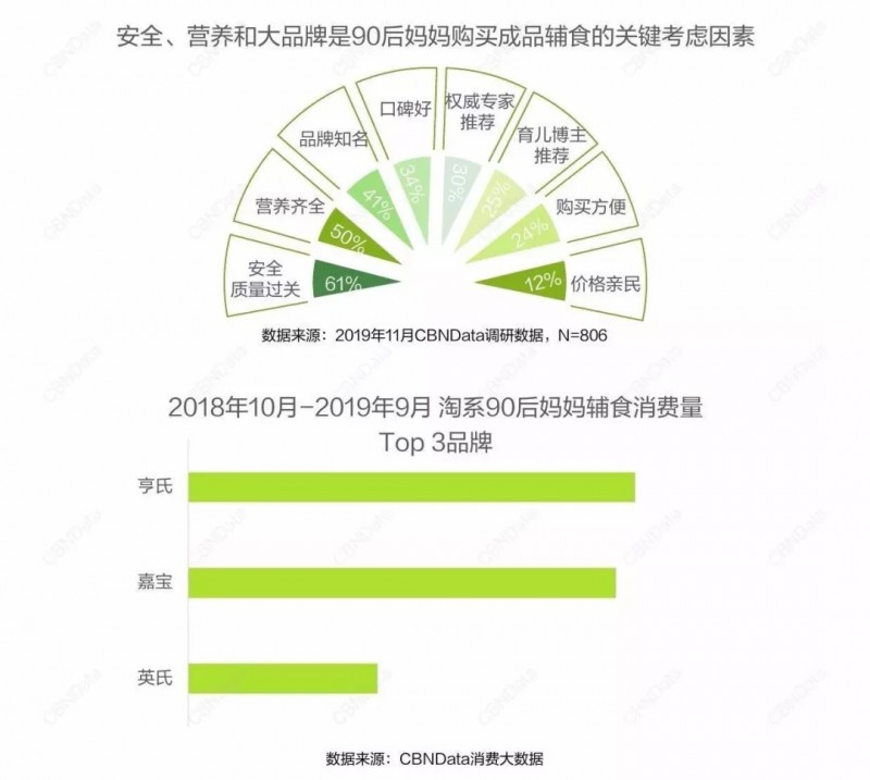 在力求省时的同时,新生代妈妈对“喂养”也有了更细分的需求。CBNData《白皮书》显示,在购买成品辅食时,新生代妈妈注重产品的安全、营养,也信赖知名品牌和口碑的力量。从近一年线上90后妈妈的辅食消费量来看,亨氏是新生代妈妈最信赖的辅食头部品牌。