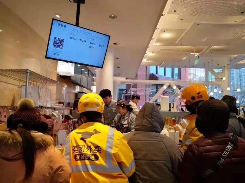 而在奈雪朝阳大悦城这家门店,中午时分倒并不是特别忙碌。下午三点开始,多家外卖小哥开始聚集在打包处。柜台内的工作节奏明显紧张起来。