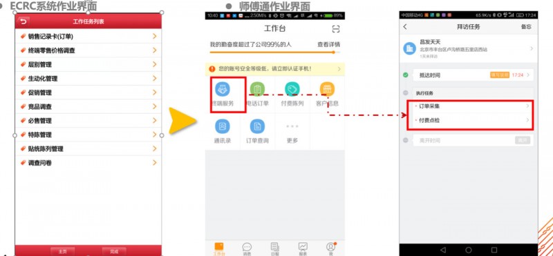 作为最早推行拜访路线图,拜访八步骤的企业,康师傅在通路上的把握具有其它企业无可比拟的优势。同样在进入互联网时代,康师傅在终端机系统管理上也是数一数二。2016年康师傅的“师傅通APP”便已经指引业务员进行作业。