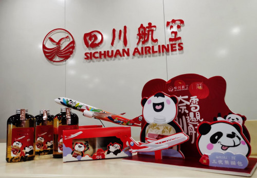 店内融入了登机口、飞机模型等航空元素,川航代言人“三优熊猫”形象也随处可见。而店内的礼物机也被统一换装。