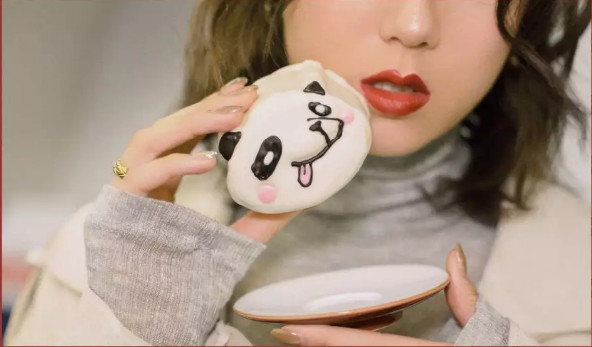 外观萌趣的熊猫造型使用巧克力淋面及手工描绘,栩栩如生,内馅则为Q弹麻薯和酥脆肉松、咸蛋黄。