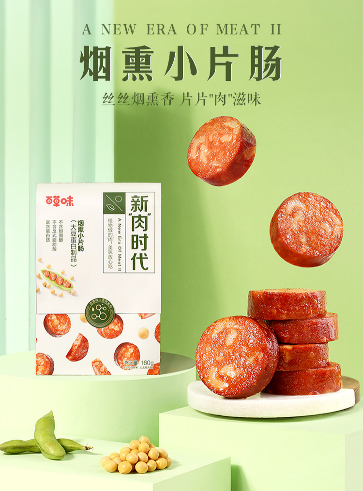 百草味率先发布国内首款“人造肉零食”-“新肉时代”烟熏小片肠。