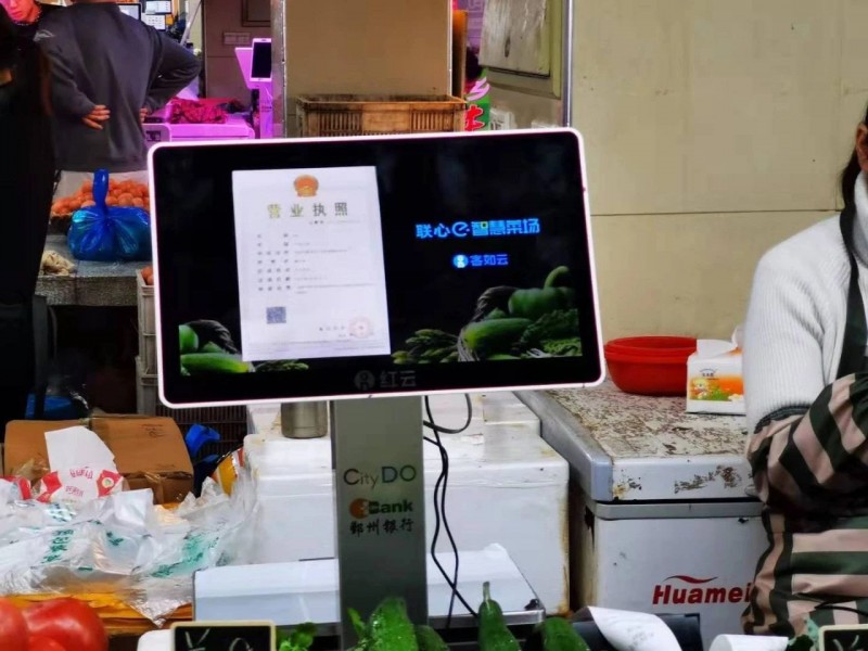 待机状态下,一体机外屏幕向顾客呈现着每个对应摊位的经营执照信息、商品种类、单价和产地等。称重的时候,屏幕上就会出现购买菜品的名称、称重、价格。结算后,可以拉出小票。与此同时,关于这一单的数据也将被实时同步在大屏上。