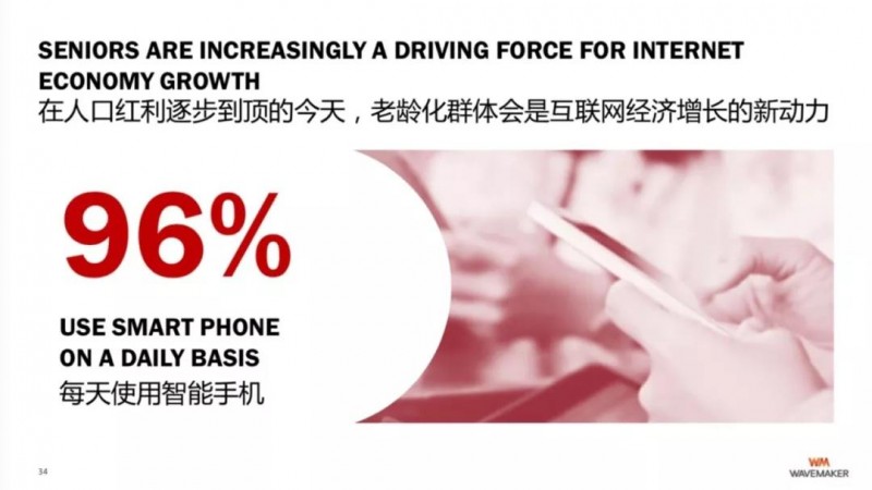 在人口红利逐步到顶的今天,老龄化群体无疑是互联网经济增长的新动力。在报告中,研究人员发现老年人对于网络的依赖性很强:96%每天使用智能手机;65%表示“我非常喜欢上网“;40%表示“通常会网购,如淘宝、拼多多”;48%表示“通常会用网上支付,如支付宝”。