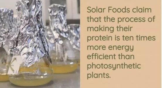 Solein是一种独特的单细胞蛋白质,只使用空气中的水,二氧化碳和电力生产。通过把微生物放入一种液体中,利用含有氢气与二氧化碳的微小气泡进行培养,待液体变浓稠后,再将其干燥成为细粉状,不会引起二氧化碳的排放,类似于酵母或乳酸菌的自然发酵。如果使用的电力来自太阳能和风能,则可以在几乎零温室气体排放的情况下生产蛋白质,唯一影响空气蛋白价格的因素就是电价。