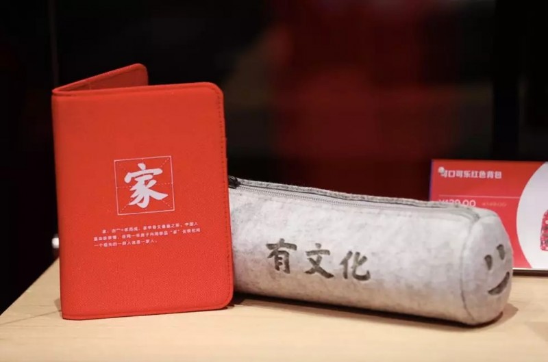 饮料瓶回收再生材料制作而成的“家”护照包和“有文化”笔袋,字体是可口可乐中国“在乎体”。