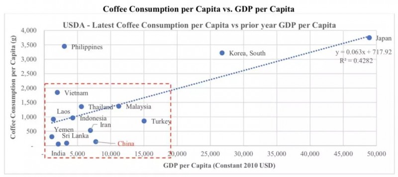 首先,“瑞幸只专注于满足中国消费者的功能性需求,即咖啡因的摄入,这个主张是不成立的。”虽然相比西方国家和日本,中国人对咖啡的消费比例还很低,但实际上中国人均86毫克/天的咖啡因摄入量已经与其他亚洲国家相当,其中95%的咖啡因摄入量已经被茶叶解决。