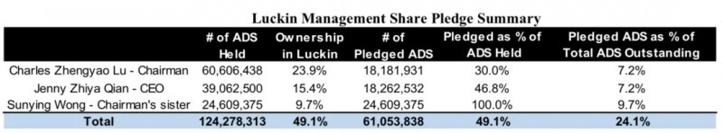这份做空报告残酷地表示:瑞幸的管理层已经通过股票质押的方式,悄悄融资套现。质押的股份数量几乎是他们全部股份的一半,按当前股价价值20多亿美元。