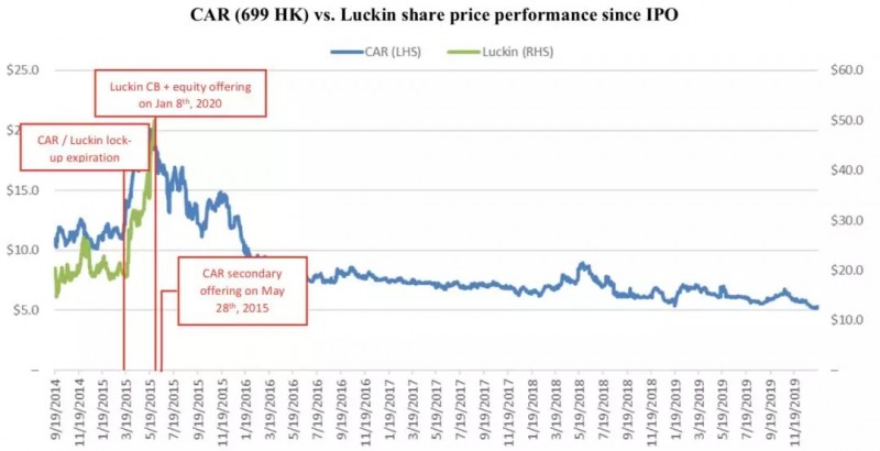 有意思的是,瑞幸上市后的股价走势,跟神州租车当年的走势极其吻合,出现了同样的波动形态。神州租车的IPO前的投资者在2015年5月28日开始通过二次发行套现,时间点是在IPO后8个月和锁定期到期后2个月。相比之下,大钲资本在2020年1月8日通过瑞幸的可转换债券和股票发行套现2.32亿美元,这也正好是在瑞幸IPO后8个月和锁定期到期后2个月。