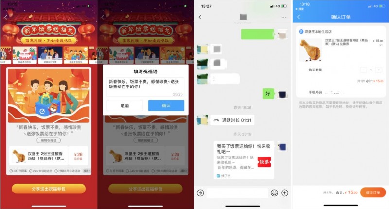拜年,送礼,送祝福,这些是春节最主要的社交手段。离春节还有一段时间,不少人的聊天群正忙着分享一张“自带祝福的饭票”。这是年货节期间,饿了么推出的全新社交送礼玩法。