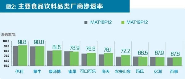 如图 2 所示,伊利作为中国乳业龙头企业,2019 年在食品饮料行业主要厂商中渗透率处于领先地位,且销售规模保持较好增长。伊利在 2019 年消费渗透率为 91.8%,在中国城市家庭中拥有着广泛的消费人群。